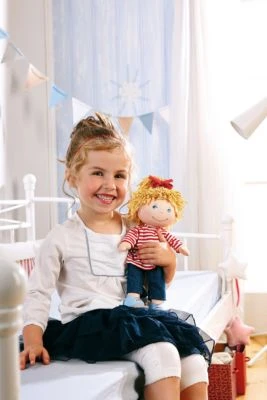 – Lieferumfang: 1 Weichpuppe mit Ringelpulli, Jeans, Schuhen und Haarschleife
