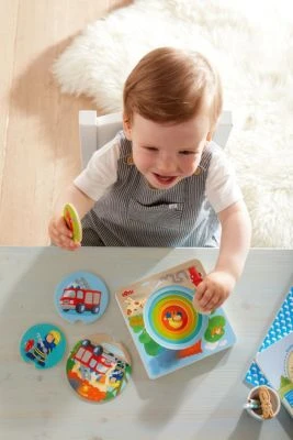 Tatütata, die Feuerwehr ist da Wer kann ihr beim Löschen des Feuers helfen? Die einzelnen Puzzleteile werden übereinander in die Aussparungen gepuzzelt. Das macht Spaß und schult die Feinmotorik.