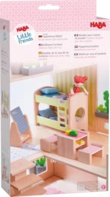 Alles, was der kleine Nachwuchs bei den Little Friends zum Heranwachsen und Spielen braucht, enthält das putzige Little Friends-Puppenhaus-Möbel Kinderzimmer für Geschwister. Das umfangreiche Möbelset verwandelt jedes Haus in ein richtiges Zuhause. Es gibt ein Doppelstockbett mit Platz für zwei Little Friends-Kinder. Ein Tisch mit zwei Hockern bietet außerdem Fläche zum Malen, Schreiben und Spielen. Eine Tafel lädt dazu ein, Schule zu spielen. Alle Möbel sind wunderschön bedruckt und sehr stabil. Dank der robusten Verarbeitung der Holzplatten ist für lange Spielfreude mit den Little Friends- Puppenhaus-Möbeln Kinderzimmer gesorgt.