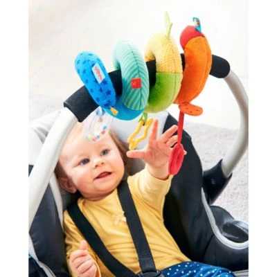 Die kunterbunte Spielspirale von HABA regt den Nachwuchs zum zielgerichteten Greifen an. Spielspirale von HABA buntes Design mit verschiedenen Anhängern ab 6 Monaten Textil und Kunststoff Mit wenigen Handgriffen ist die Spielspirale befestigt – zum Beispiel am Buggy, an der Babyschale oder am Gitterbett. Leuchtende Farben und drei verschiedene Anhänger wecken die Aufmerksamkeit des Kindes und animieren es zum Greifen. So fördert das Babyspielzeug die Auge-Hand-Koordination und die feinmotorischen Fähigkeiten. Dank der einfachen Montage ist die Spielspirale die ideale Beschäftigung für unterwegs.