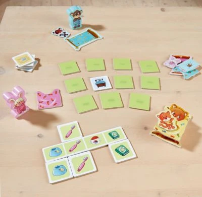 Es ist höchste Zeit fürs Bettchen! Doch Hase, Bär und Katze können nicht schlafen, denn ihre Betten, Kopfkissen und Decken sind durcheinandergeraten. Außerdem braucht jedes Tier unbedingt noch sein Lieblingskuscheltier. Wenn die Kinder ein gutes Gedächtnis und auch ein bisschen Glück beim Aufdecken der Plättchen haben, gelingt es ihnen, die Tiere schnell ins Bett zu bringen.