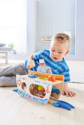 Für hammermäßig viel Spaß: Diese Klopfbank in Form eines bunten Schiffes bietet gleich zwei Spielfunktionen in einem. Die drei mitgelieferten Kugeln passen durch je ein Loch hindurch und lösen lustige Reaktionen aus, wenn sie hindurchgeklopft werden. Wird die Kugel Kapitän Karl durch den blauen Ring geklopft, läutet sie im Schiffsrumpf ein Glöckchen. Und wenn die grüne Kugel durch das Loch mit dem grünen Ring fluppt, dann fällt sie direkt in ein cooles Cabrio, das schon zur Weiterfahrt bereitsteht. So stehen Kindern sowohl eine Klopfbank als auch eine Kullerlandschaft zur Verfügung. Natürlich ist im Spielset auch ein Hammer vorhanden. So bekommt der Begriff „hammermäßiger Spaß“ eine ganz neue Bedeutung!