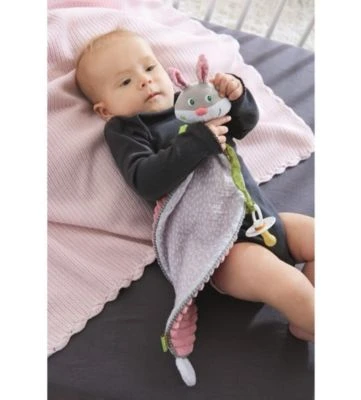 Hoppel, Hops Dieses niedliche Langohr ist zugleich Spielgefährte und Kuscheltuch Ist es zusammengerollt, wird aus dem Schmusetuch schnell eine süße Spielfigur mit spannenden Elementen zum Fühlen, Hören und Entdecken.