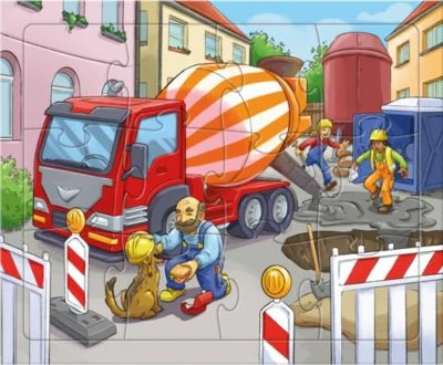 Spannende Szenen spielen sich auf den Baustellen ab: Der Kran hebt gerade ein Rohr an, in dem sich eine Katzenfamilie versteckt hat. Der Bagger gräbt ein uraltes Dino-Skelett aus. Der Betonmischer verschüttet seine ganze Ladung auf der Straße, während sich ein Bauarbeiter mit einem Hund anfreundet. Stück für Stück entdecken Kinder ab 3 Jahren die Baustellen-Puzzles mit vielen Details. Das animiert zum Erzählen und erweitert den Wortschatz. Ganz nebenbei trainieren kleine Puzzle-Meister Konzentration und Feinmotorik. Die Kinder-Puzzles bestehen aus stabiler Pappe und sorgen lange für riesen Puzzle-Spaß. 290cm x 240cm x 51cm