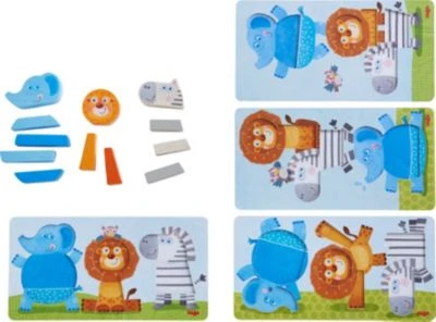 Zebra, Löwe und Elefant sind ein tierisch wildes Trio. Das beweisen sie in dem farbenfrohen Legespiel Tierisch wild von HABA. Auf jedem der vier Einlegetableaus führen sie neue Kunststücke vor. Die Kinder ergänzen die Aussparungen auf den Motiven mit Holzteilen in den entsprechenden Farben. Auf jedem Bild liegen die Holz-Puzzle-Teile anders. Das sorgt für Abwechslung und regt die Kreativität kleiner Tierfans an! Das Kleinkindspiel ist eine tolle Übung für das genaue Schauen, die Feinmotorik und das Zuordnen von Farben und Formen. Die zauberhaften Tiere laden immer wieder zum Puzzeln ein!