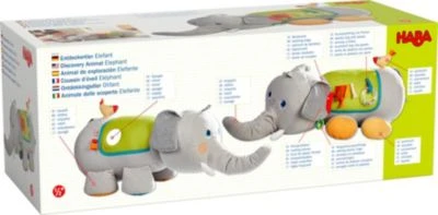 Das niedliche Entdeckertier im Elefantendesign von Haba eignet sich klasse als Schmuse- und Spielpartner für Kinder! Der süße Elefant bietet jede Menge tolle Spielmöglichkeiten für kleine Entdecker*innen. Hier gibt es verschiedene Texturen zu erkunden und in dem Spiegelchen können Kinder sogar sich selbst entdecken. Der Elefant bietet viele tolle Rassel- und Greifelemente, hat einen beweglichen Kopf und ein quietschendes Vögelchen auf dem Rücken. Das Öhrchen mit Beißkante dient zudem für die Zahnfleischmassage bei zahnenden Babys.