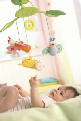 Fröhlich flattern die bunten Schmetterlinge über Bettchen und Wickeltisch. Als Greiflinge zwitschern, quietschen oder rasseln sie in Babys Hand. Die Anhänger sind mit Klettverschlüssen befestigt und lassen sich abnehmen. Unsere Entsorgungshinweise zu Batterien und Elektrogeräten finden Sie auf http://www.mytoys.de/c/entsorgungshinweise.html